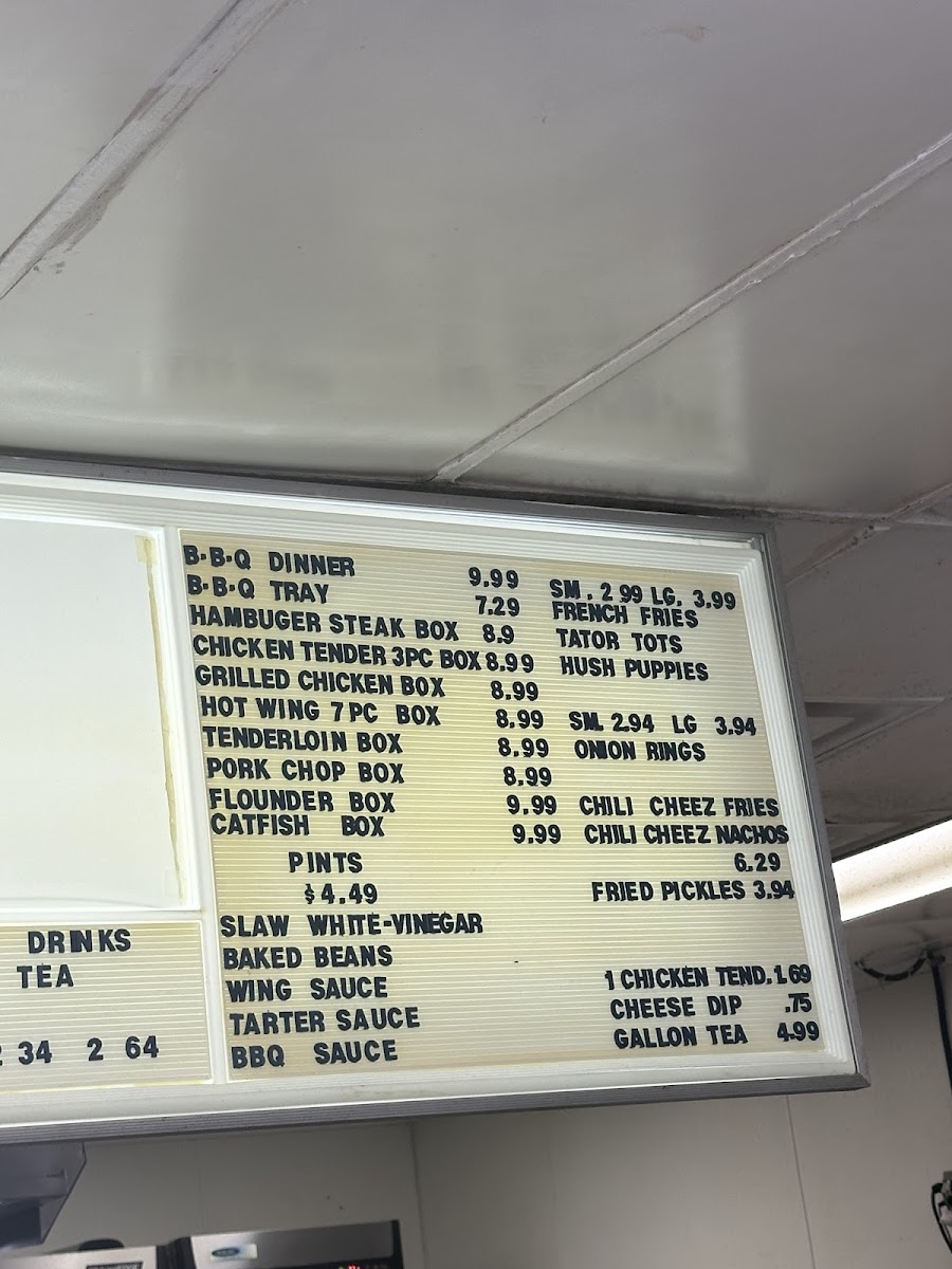 served with slaw (white or red), French Fries, Baked Beans & Hushpuppies